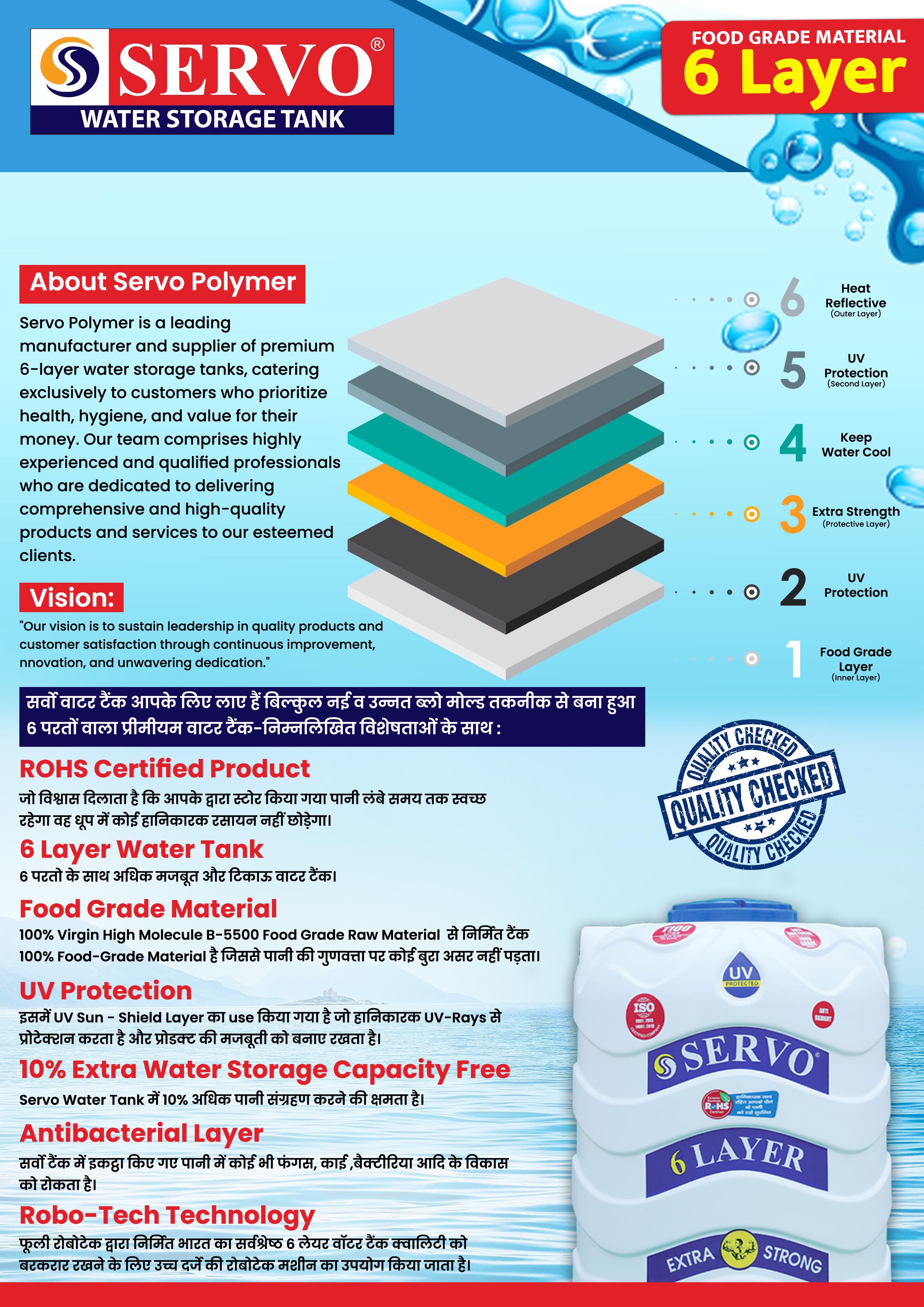 Servo Polymer is not just a manufacturer of water tanks; we are your partner in ensuring that the water you use is of the highest quality. Our commitment to health, quality, and affordability makes us the preferred choice for discerning customers. Choose Servo Polymer, and experience water storage like never before. Feel free to ask